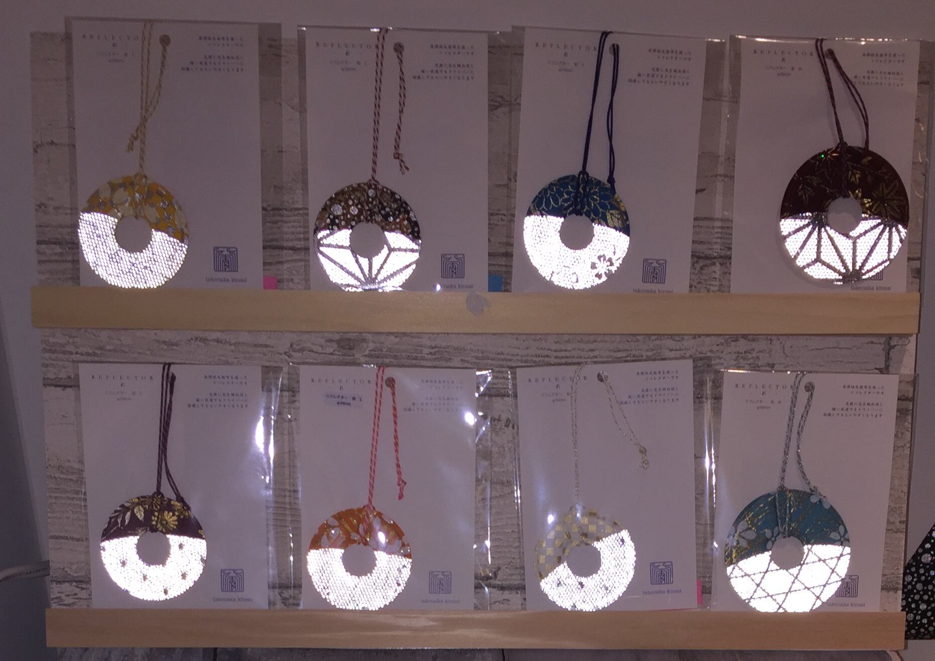 リフレクション部分(下半分)には、「麻の葉」「鱗」「籠目」など、「厄除け」の意味がある文様を伝統の型箔技法で表現しています。お守り感覚でバッグにつけて頂くのもオススメです。