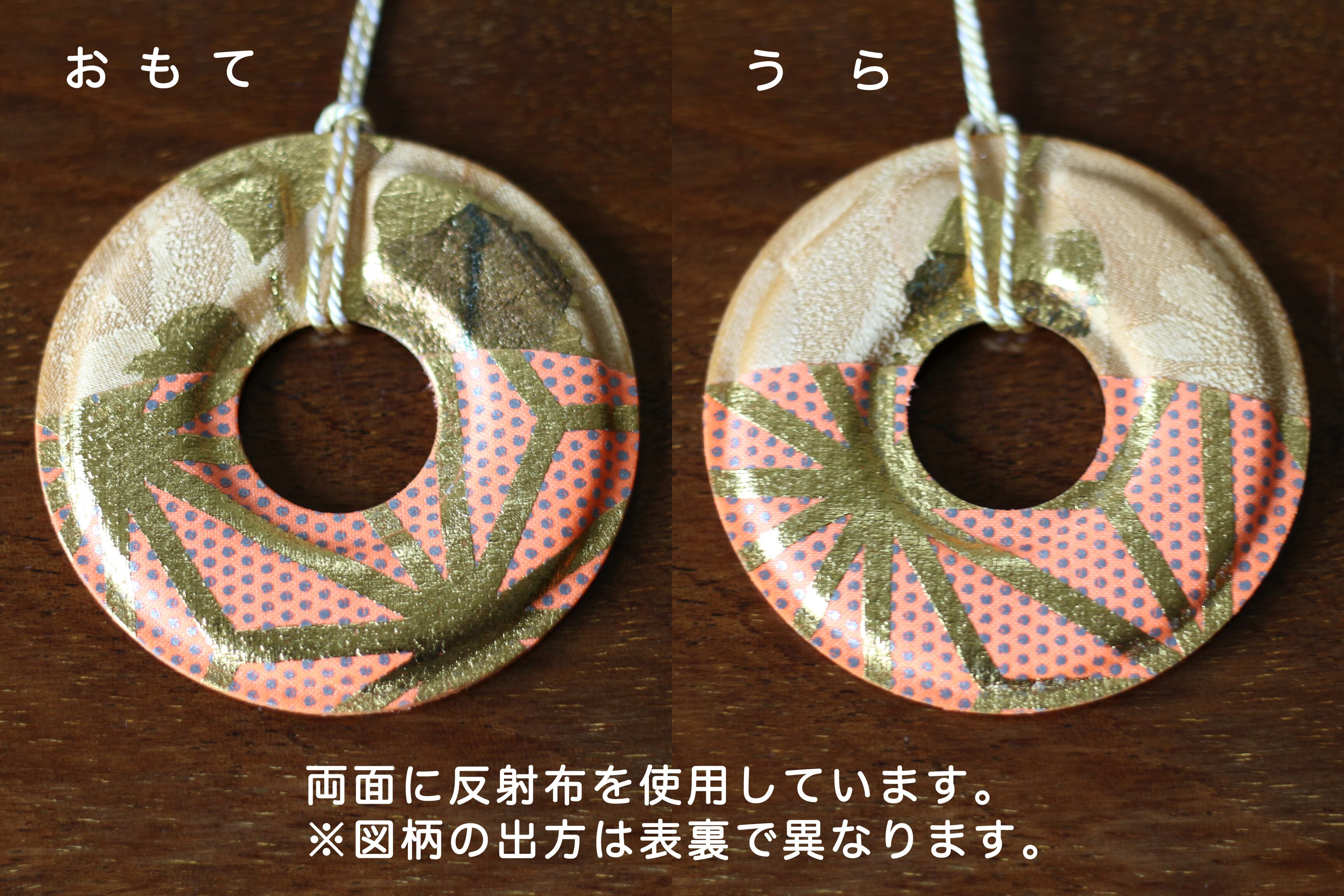 リフレクション部分(下半分)には、「麻の葉」「鱗」「籠目」など、「厄除け」の意味がある文様を伝統の型箔技法で表現しています。お守り感覚でバッグにつけて頂くのもオススメです。