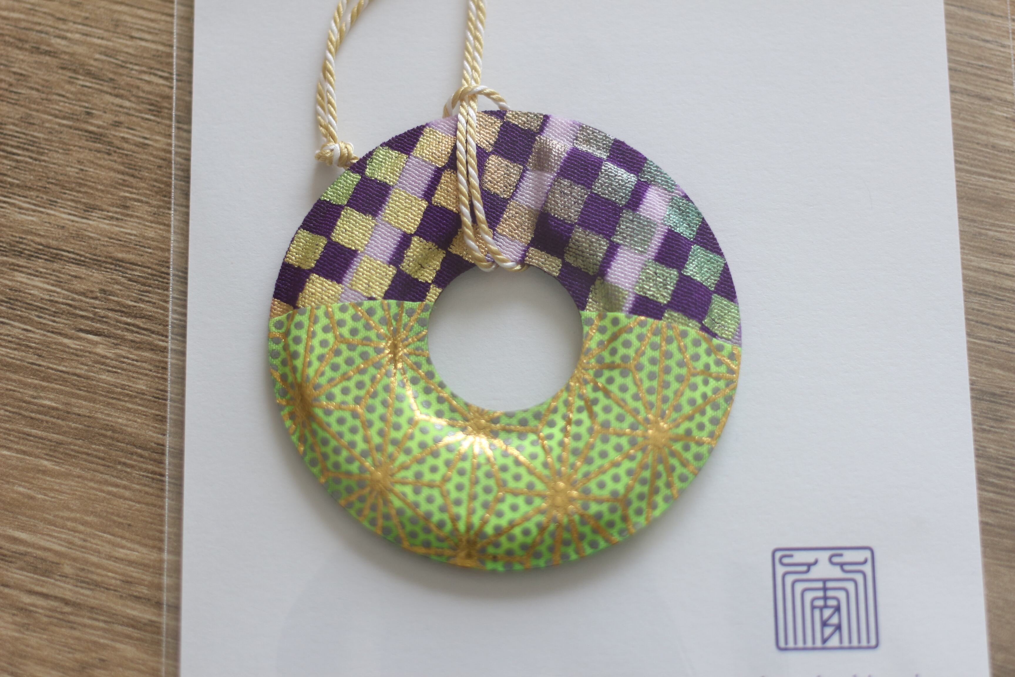 リフレクション部分(下半分)には、「麻の葉」「鱗」「籠目」など、「厄除け」の意味がある文様を伝統の型箔技法で表現しています。お守り感覚でバッグにつけて頂くのもオススメです。